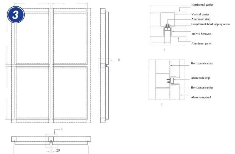 Check and adjust the frame carefully to make sure it is level, straight, and properly aligned before installing the panels. Then install the aluminum panels in the planned sequence, ensuring each panel is fixed securely and the joint lines remain neat, even, and consistent.